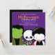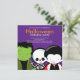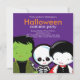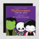 Comece a festa de Dia das Bruxas de seus Filhos com nosso Convite de festas de Halloween feliz para crianças apresentando o esqueleto mais bonito Frankenstein & dracular em um fundo roxo. Disponível com outras crianças vestidas em nosso compro em www.celebrateitholidays.com. Personalize com suas informações pessoais e você está pronto para ir. © Designs Zenware