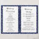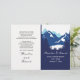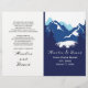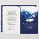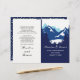 Montanhas azuis e coníferas dobraram o programa de casamento. Um design de casamento tendencioso e elegante que apresenta uma cordilheira através de coníferas e seus nomes em estilo manuscrito. O dentro inclui bordas azuis e brancas com bolinhas e quadros brancos com seu texto.