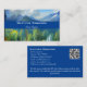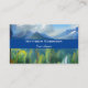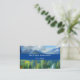 Um cartão de visita com pintura de montanhas e uma floresta com árvores verdes.