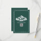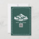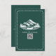 RSVP de Casamento com montanhas e ilustração evergreen e canoe com borda escalpada. O fundo é esmeralda. Personalize o texto e o código QR.