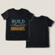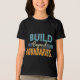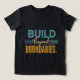O design de t-shirt contém a frase "Construir além dos limites", que aparece de forma destacada na tipografia ousada e moderna. As palavras são colocadas sobre um fundo dinâmico, abstrato que sugere movimento e potencial ilimitado. O design geral transmite um sentido de ambição, inovação e o poder de superar obstáculos.