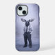 A composed anthropomorphic moose dressed in a classic shirt, tie and suspenders, standing within a misty forest setting. The cool monochrome palette and minimalist styling create a calm yet powerful statement piece for modern interiors.