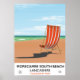 Morecambe South Beach Lancashire, poster, poster viagens vintage de uma cadeira de pavimento listrado numa praia arenosa.