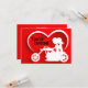 Casal de silhueta dirigindo uma motocicleta com um convite para casamentos cardíacos em vermelho, branco e preto. *