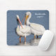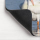 Mouse Pad com dois pelicanos brancos engraçados. Parece que um dos Pelicanos está pedindo um encontro ao outro. Ambas estão cercadas em água azul com reflexões brancas. A imagem foi tirada na Reserva de Vida Selvagem do Querido Ding na Ilha Sanibel, FL., EUA.