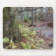 Cai num jardim botânico. Enorme tronco de árvore, lagoa d'água enchendo com ricas plantas coloridas do outono.