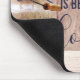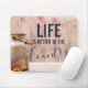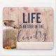 Um mousepad com um design rústico de campo. Uma velha lata de leite enferrujada na moda. Trigo e papoulas vermelhas desbotadas ao fundo contra um painel de madeira tênue. A madeira é apenas uma imagem, não é real. O texto diz que a vida é melhor no campo.