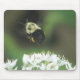 Uma fotografia linda e próxima da natureza, em detalhes espantosos, de uma abelha deslumbrante em voo enquanto voa para longe das deliciosas flores brancas de chive de alho em primeiro plano. Uma nova decoração de verão que é útil e adiciona um toque adorável ao seu armário, parede cúbica ou geladeira.