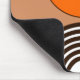Este mouse pad tem um design geométrico de um semicírculo laranja acima de arcos pretos e brancos com um círculo brando acima de tudo.
