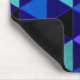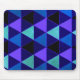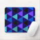 Design geométrico de Ron Trickett em roxo claro, azul claro, azul marinho e verde claro. Padrão de triângulo