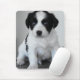 Cute portrait photograph of a black and white puppy sitting obediently for the camera.