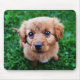 Adorable portrait photograph of a puppy sitting in the grass staring up at the camera.