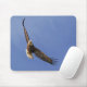 Uma águia careca adulta em uma curva acentuada destacada por um céu azul.