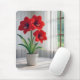 Uma planta de amarílis vermelha com três grandes flores adorna uma mesa redonda, suavemente iluminada pela luz que filtra através das cortinas transparentes