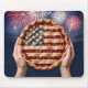 Two hands proudly lifting a cherry pie adorned with a beautiful American flag crust design, set against a dazzling backdrop of fireworks