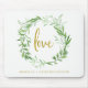 Este tapete do rato na moda, botânico caracteriza uma grinalda verde das folhas em um fundo branco limpo, com a palavra "amor" no centro na tipografia do olhar do ouro do falso. Adicione seus nomes no texto de harmonização. Nós usamos a arte de LABFcreations.
