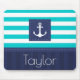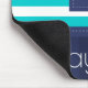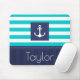 Mousepad náutico com padrão listrado azul-turquesa e marinho e texto personalizável.