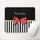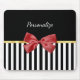 Um elegante bloco de bocas, com faixas verticais pretas e brancas, embelezado com uma banda colorida FAUX chic e uma imagem de um arco clássico de fita vermelha. Personalize-o adicionando o nome daquela garota especial na sua vida. Imagem plana, NÃO metálica ou arco real.
