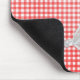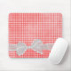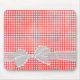 Fita e arco brancos translúcidos sobre fundo de gingham branco e vermelho.