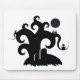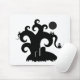 Silhueta de uma árvore branca com corujas de olhos grandes sobre os galhos acolchoados com um casal de pedras visíveis abaixo. Uma lua negra silenciada pode ser vista à distância.