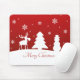 Simples ilustração de Natal moderna e minimalista, com silhuetas brancas de renas, árvores, bonecos de neve e flocos de neve, com Feliz Natal a saudar de fundo vermelho.