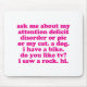 Pergunte-me sobre minha transtorno de deficit de atenção ou torta ou meu gato. Um cão. Eu tenho uma bicicleta. Fazem você gostam da tevê? Eu vi uma rocha. Olá!. - Jomadado é o original & o criador oficial deste ADICIONA citações. Disponível em artigos para homens, mulheres & crianças. Vários tamanhos e cores disponíveis para a maioria de artigos. Impressão cor-de-rosa.
