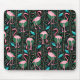 Este design decorativo do mousepad do teste padrão elegante do pássaro do flamingo é feito em um estilo retro do art deco 20s. Os flamingos cor-de-rosa brilhantes descansam contra um fundo que inclua as frondas da samambaia em cores corajosas e em formas retangulares geométricas nas máscaras do verde da cerceta/azul de turquesa, tudo em um contexto do preto. Este design original, estilizado é perfeito para qualquer um que ama estes animais tropicais e está procurando um teste padrão elegante com uma torção retro do 1920.