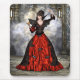 Renderização digital em 3D de um belo feiticeiro feminino em um vestido vermelho e preto com asas em um fundo de castelo fantasticamente assustador