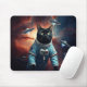 Uma imagem cativante de um gato negro vestido de astronauta, olhando com confiança para o cosmos. Cercado por discos voadores e nebulosa vibrante, o gato incorpora um senso de aventura e mistério.