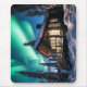 Belo bocal com a bela Aurora borealis sobre a cabana de inverno.