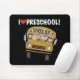 Um auto escolar amarelo encheu-se com os miúdos e o texto que me lê "o pré-escolar (do coração)!" é caracterizado em t-shirt prées-escolar do professor e do estudante, sacolas da escola, etiquetas, mousepads, ímãs, cartões, e mais!