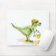 Bebê giro Tyrannosaurus Rex com balde de areia e chapéu no castelo de areia