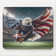 Uma águia-careca a agarrar uma bola de futebol é destacada, enfiada numa bandeira americana, a brilhar sobre um estádio de futebol iluminado de forma brilhante.