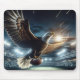 Uma águia-careca majestosa mergulha num estádio de futebol iluminado com brilho, agarrando uma bola de futebol americana nos seus talões.