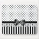 Um padrão preto e branco, no estilo feminino vitoriano, com bolinhas na moda no topo e faixas no estilo de tendência no fundo divididas por um local de ilhotas e uma fita preta amarrada em um arco chic.
