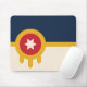 Mousepad com um design com a bandeira de Tulsa, Oklahoma. Uma bandeira azul bege e marinho com um escudo de Osage dourado contendo um círculo vermelho e uma estrela bege de seis pontas