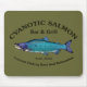Um Salmão de Sockeye de tom azul com texto que diz "Cyanotic Salmon Bar & Grill Kenai, Alaska" e "Combate ao Descanso e à Relaxação da Pesca. A pesca do salmão é muito popular, muito popular no Alasca. Imaginem centenas de passadores, quase ombro a ombro, alinhando ambos os bancos de um riacho tentando evitar linhas cruzadas com todo mundo na esperança de pousar um grande salmão. Isso é pesca de combate. Depois de um dia, pegue um pouco de R&R no mítico Salmão Cianotico no Kenai. Contos de pesca contados lá...algum verdadeiro.