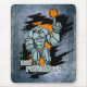 O homem de monstro enorme está girando um basquetebol em seu dedo. O texto diz o Playmaker do ferro.