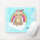 Um desenho animado de uma preguiça meditante. Vestindo uma coroa de flores silvestres na cabeça, flutuando pacificamente numa nuvem branca com um arco-íris colorido atrás. Um casal de corações perto. Pacífico e feliz. O plano de fundo é uma imagem de estilo azul-claro. Personalizar com um nome