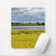 Um campo de canola amarela vibrante floresce sob um céu dinâmico, com manchas de nuvens fluffy lançando sombras na paisagem. Ao fundo, uma banda contrastante de árvores verdes escuras separa o campo de uma extensão tranquila de água. Esta imagem foi tirada perto de Streatham em Victoria, Austrália.