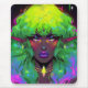 Uma linda e gloriosa rainha elvada. Ela tem lábios de cheio com batom roxo rosado rosado rosado e pestanas compridas. Ela tem uma bela e brilhante cabeleireira de verde limão que fica mais escura na direção das extremidades. Ela tem orelhas elvadas e um lindo colar de ouro.