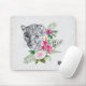 Um mouse pad com uma bela ilustração apresentando uma cinza, um retrato leopardo preto e branco. Este adorável animal está cercado por um buquê de flores tropicais. Elegante, exótico e adorável.