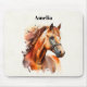 Mousepad com uma bela ilustração. Cabeça e corpo superior de um cavalo castanho de cobre castanho. Com manchas de aquarela atrás.