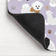 Cão-de-bichão-gato frita em suéteres e arcos com ossos de cão espalhados e estampas de pata em fundo roxo claro.