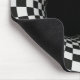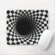 A tunnel-like optical illusion is created using a black and white checkered pattern, giving a dizzying sense of depth
