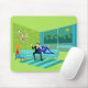 Este design Retrorromântico de Casal Mousepad é simplesmente fabuloso! O estilo dos anos 60, design de arte minimalista, apresenta um casal atraente aproveitando uma noite romântica. Eles estão abafados em sua linda e moderna seção turquesa, em sua casa de Primaveras de Palm. A sofisticada sala de verdes limões destaca uma parede verde inclinada de pedra, na qual a arte de pebolha de kitschy e vintage está pendurada. Uma lâmpada laranja divertida com uma sombra de fibra de vidro de duas camadas enfeita uma mesa lateral. Os homens bem vestidos estão segurando martinis. Através das portas de vidro deslizantes, uma lua de cheio acende-se à noite, montanhas de fazer, palmeiras e uma piscina de natação visível. Saúde à noite perfeita!