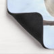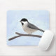 Mouse pad com a minha ilustração digital original de aquarela de um Chickadee com prego preto emperrado num galho sem folhas contra um céu azul pálido.