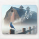 Um pássaro azul é tocado num posto de cerca de madeira com notas musicais e símbolos que fluem do seu bico e um velho celeiro de fazendas rústico com uma bandeira americana