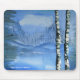 Tem uma imagem da tradicional pintura de Dawn K. Williams, "Tranquil Lake", uma paisagem azul e verde com pinheiros e pinheiros, colinas rolantes e um lago reflexivo.