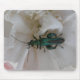 Este bocal apresenta uma fotografia de uma espécie britânica de Flower Beetle, de cor verde-azulada, sentada sobre uma flor de cravo branco. A foto foi tirada usando macro fotografia para mostrar o detalhe e a cor dessa bela espécie de besouro.